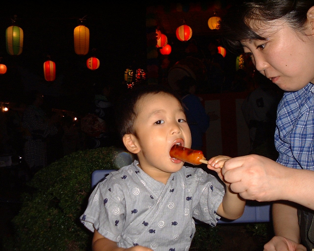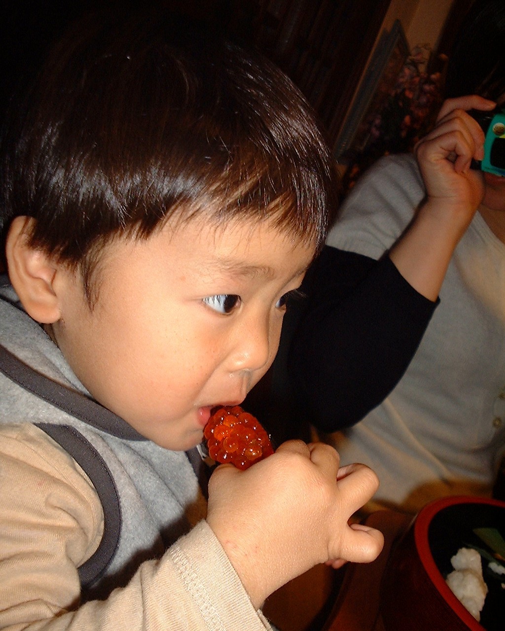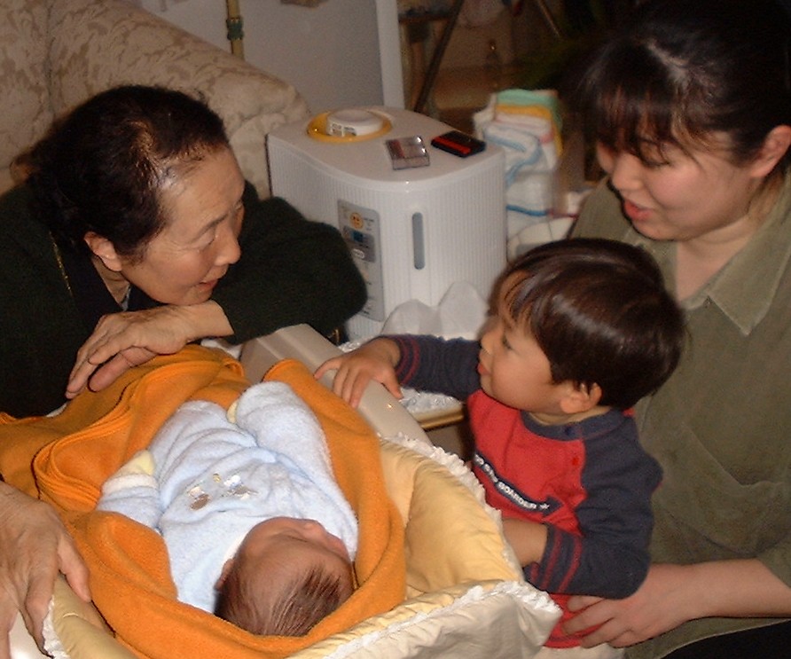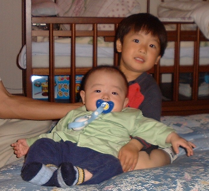 | 2歳になりました。初めて生のおすしを食べたんだ。 | いとこのゆいくんちに行ったよ。左上はひいばあちゃんだよ。 | 砧公園に行ったよ。飛行機のパイロットになったんだ。 |