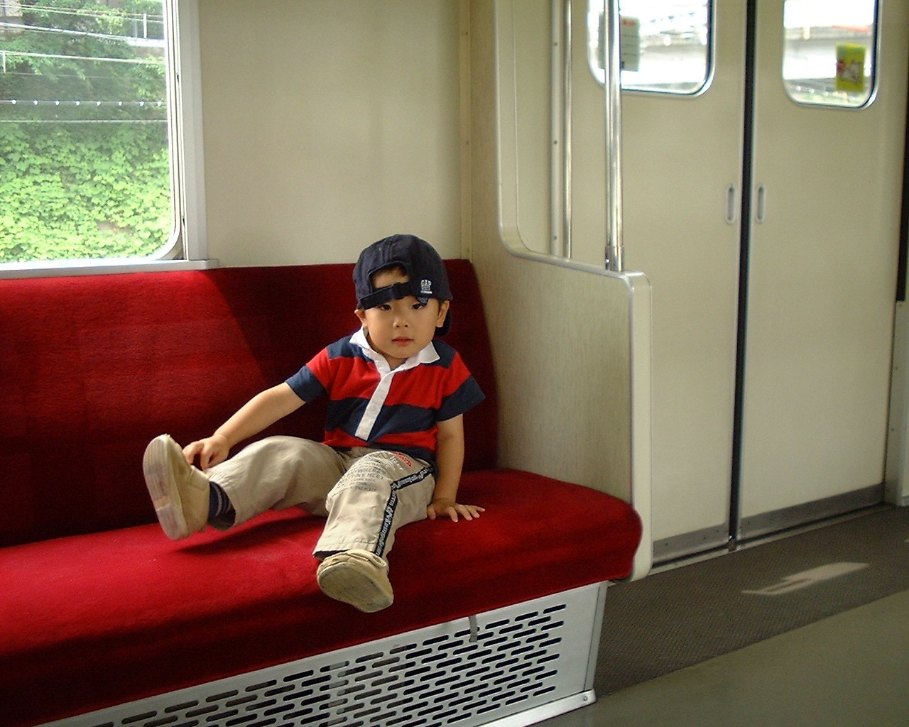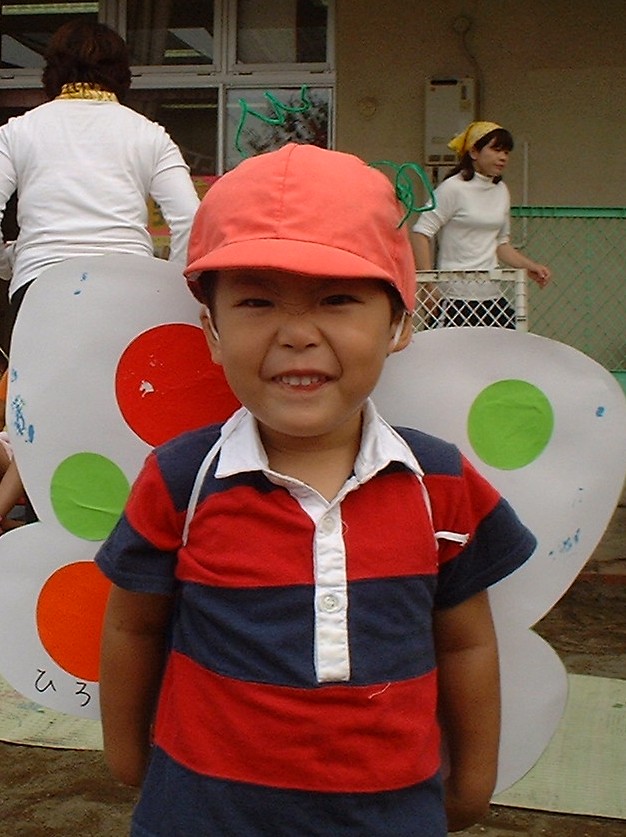 | バーベキューに行ったよ。アスレチックもしたんだー!後ろはお友達のショウタ君だよ | また電車に乗ったよ。電車の寝るとこも見たよ | 保育園の運動会だよ。ちょうちょになったんだ |