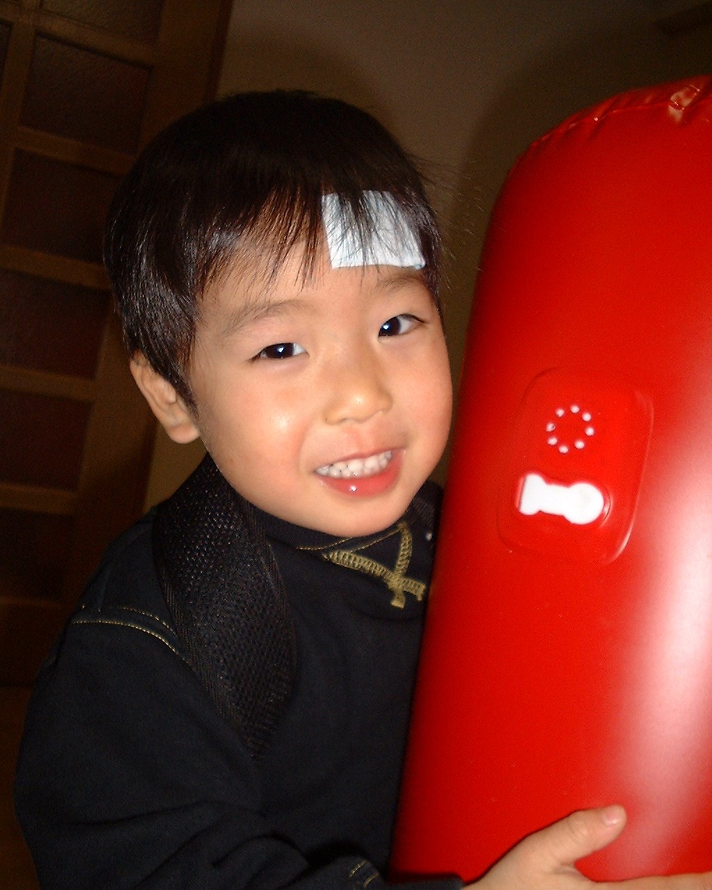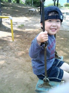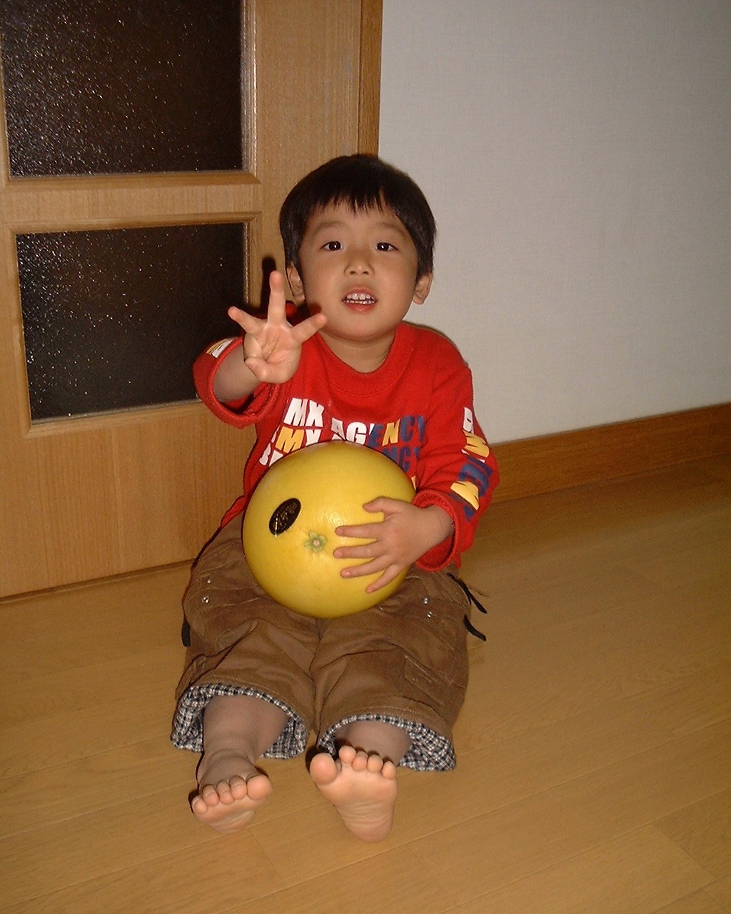 | 3歳になりました。おでこはお友達とごっちんしちゃったの | 九州土産のバンペイユだよ。ぼくの頭とどっちが大きいかな? | 母さんと電車の見える丘公園に行ったよ。母さんは一人でブランコに乗れないと思ってたんだよ。えっへん! |