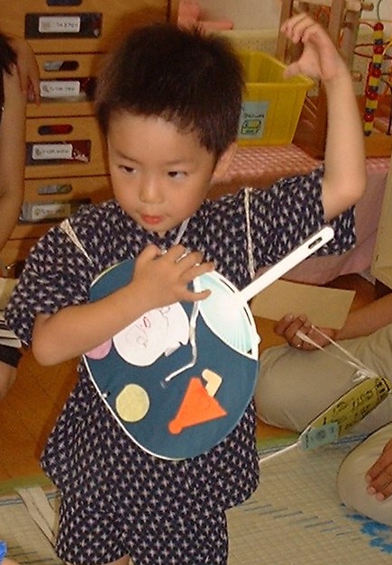 | 保育園のお祭りだ!手作りうちわをギターにしてみたよ。 | 近所の盆踊りに出かけたよ。青葉音頭を踊ってみたんだけど…来年はやぐらに上りたいな。 | こうさと初CHU〜しちゃった☆ |